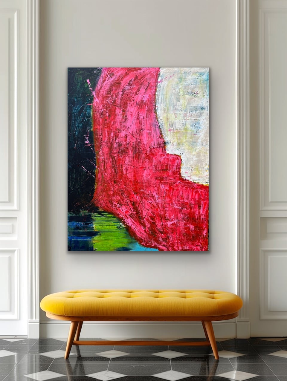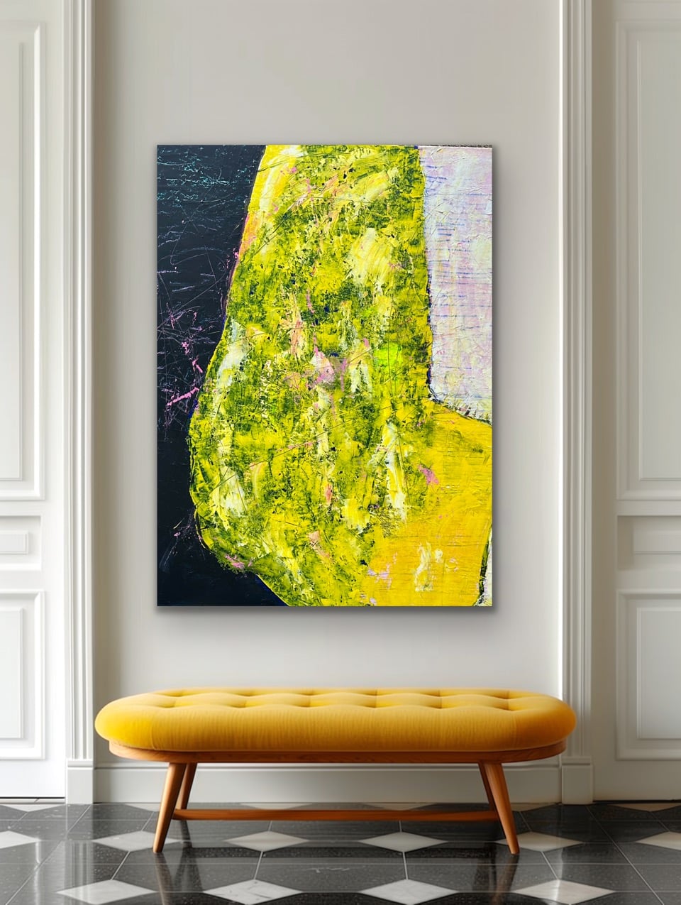 Memories er et farverigt og lyst og let maleri i gule og grønne nuancer med forskellige pink toner samt sort. Effekter med oliepasteller og blyant- bl.a. i guld. Maleriet fortsætter om på kanterne.